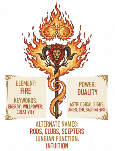 Aleister Crowley similarly described the suit (called Wands in the Thoth system) as the expression of pure will and spiritual force, the element that initiates movement and transformation. Together, these traditions emphasize that Fire in tarot represents the will to act and the courage to pursue one’s vision.